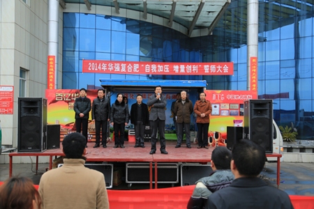 2月7日,农历正月初八上午9点18分,农贸公司办公大楼前广场鞭炮阵阵,群情沸腾。我公司2014年华强复合肥自我加压、增量创利誓师大会和营销人员出征仪式在这里隆重举行,集团公司领导均出席誓师大会。