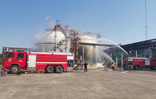 本次演练共分为四个环节,事故预警与现场处置方案启动,公司专项应急预案启动,区级预案启动,应急演练终止与评价。本次演练模拟8月27日上午8:30左右,氨库岗位操作工到液氨球罐区域进行巡回检查,发现1号氨球罐根部排污阀阀前法兰连接垫子刺,导致液氨外泄。操作人员发现后,迅速报告当班班长和调度,并现场处置,处置过程中两人相继中毒倒在事故现场。公司接到信息报告后,启动应急预案实施救援。随着泄漏量不断增大,公司迅速向湖北当阳经济开发区管委会及相关部门报告险情,请求支援。湖北当阳经济开发区管委会启动《湖北当阳经济开发区当阳坝陵化工园生产安全事故应急预案》。